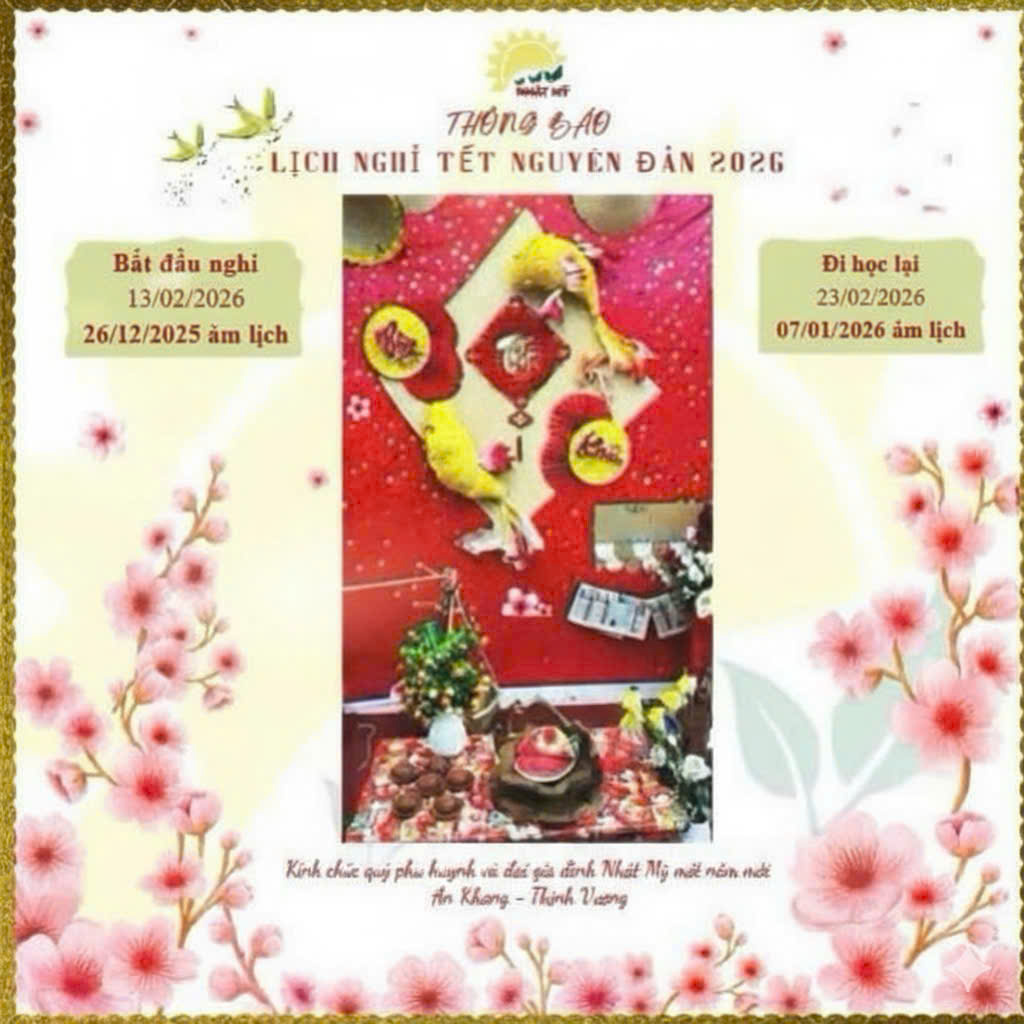 Trường Mầm non Nhật Mỹ – Trung tâm Anh ngữ Liên Việt Mỹ xin trân trọng thông báo đến Quý Phụ huynh lịch nghỉ Tết Nguyên Đán như sau: